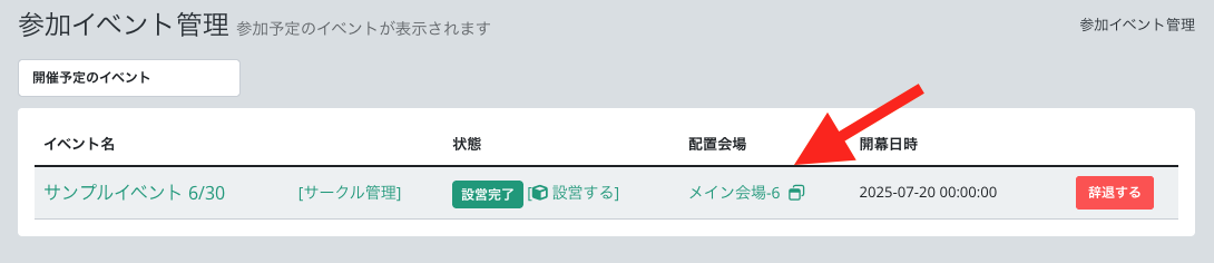 参加イベント画面に移動して、配置会場をクリックして、入場します