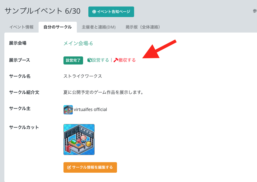 サークル管理 - 自分のサークル タブの「撤収する」をクリックします。