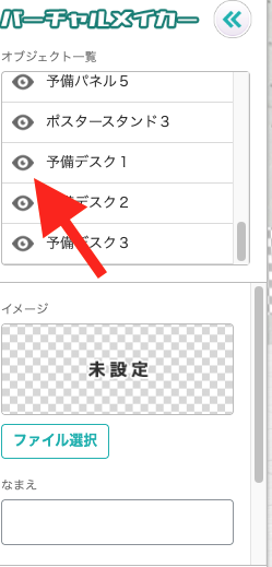 不要なオブジェクトは左の一覧から非表示にすることができます。名前の前の目のアイコンをクリックしてください。