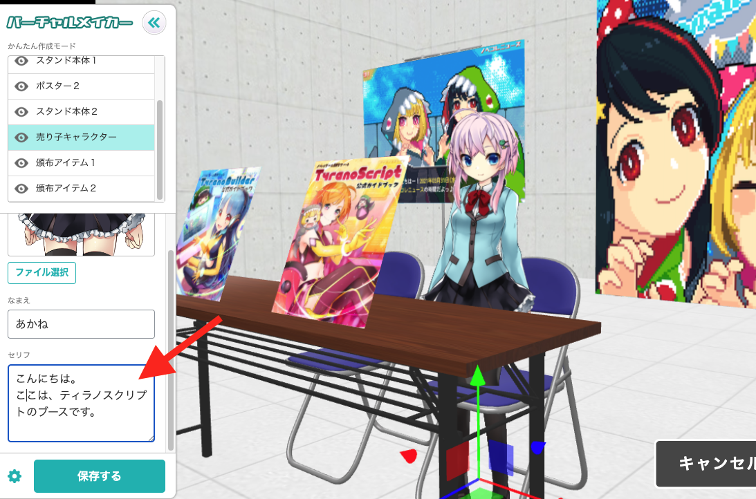 「売り子キャラクター」を選択して、セリフの欄にしゃべらせたいテキストを記述します。